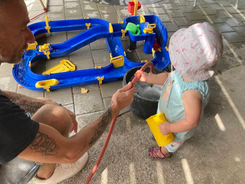 Bei so heißem Wetter ist eine Abkühlung genau das richtige! Wir haben eine kleine "Wasserbahn" aufgebaut und befüllt. Dabei wurde fleißig mit dem Gartenschlauch mitgeholfen! Sogar unsere Pflanzen haben eine kleine Abkühlung erhalten 🌱 💦