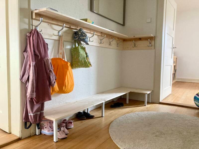 Unsere Garderobe ist letzte Woche auch fertig geworden! So hat nun jedes Kind sein Plätzchen für seine Kleidung und Schuhe! Aktuell ist die Garderobe noch etwas leer, doch das ändert sich in den kommenden zwei Wochen, da wir hier gleich vier neue „Zwergnasen“ begrüßen dürfen! 🎉
