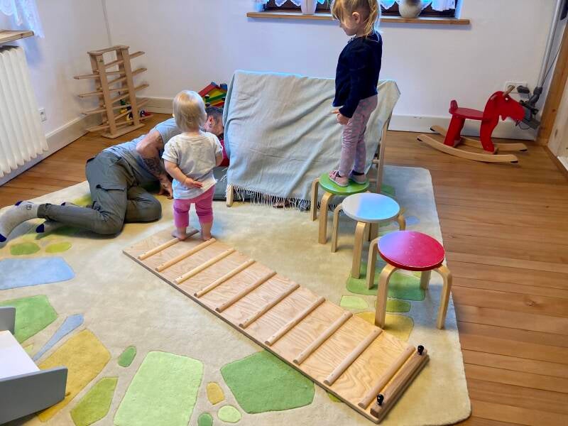 Die Rutsche unseres Kletterdreiecks wurde umgedreht auf den Boden gelegt und bot so eine tolle Möglichkeit zum „Hindernislauf“. Erweitert wurde das ganze durch Hocker, erst nur mit einem, doch Ruck zuck wurden weitere Hocker geholt und dazugestellt. Es wurde hinaufgestiegen, hinunter geklettert und gesprungen und so manch einer versteckte sich auch in unserem „Zelt“.