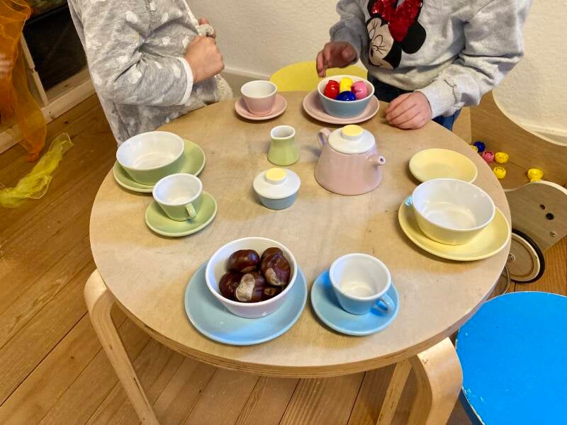 Unser Spielmaterial für die "Kinderküche" wurde erweitert mit Keramiktellern, -tassen und -kännchen. Den meisten Spaß haben die Kinder am "einschenken" mit der Kanne! Besonders beliebt waren hier die letzten beiden Tage auch die ganzen Quetschi-Deckel, welche wir geschenkt bekommen haben, an dieser Stelle nochmal ein großes Dankeschön! Sie werden benutzt zum kochen, aber auch zum herum rollen, oder am allerliebsten einfach zum durchmischen mit den Händen! So manch einer hier steckt sie sich sehr gerne auf seine Finger, sie finden also vielseitig Einsatz in unserem Alltag.