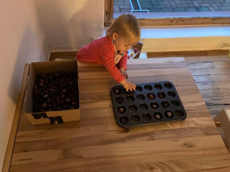 Dank einer großzügigen Kastanienspende 🌰 rollen bei uns so allerlei Kastanien herum. Mit ihnen wird gerne gekocht, sie werden aber auch ganz gerne in die Muffinbleche „sortiert“ oder einfach mit den Händen erfühlt und „verwühlt“.