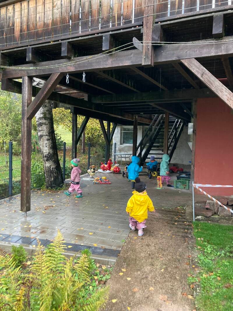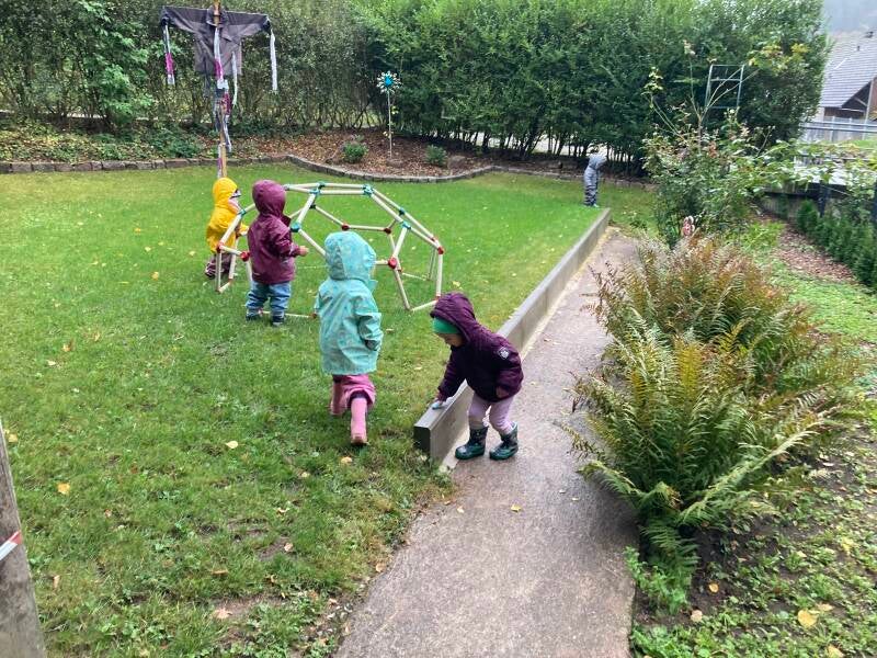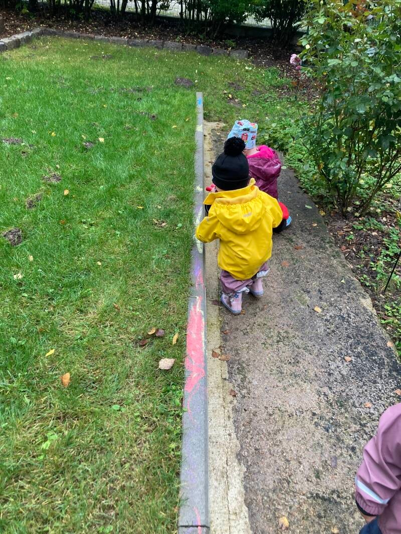 Der Herbst ist da und bringt uns so allerlei Regenwetter! 🌧️ Doch das hält uns nicht davon ab raus zu gehen und Zeit im Garten zu verbringen. Die Zwergnasen haben die Regentropfen versucht mit den Händen zu fangen und waren sehr erstaunt als sie merkten das unser Klettergerüst nass ist. Mit großer Begeisterung wurde an der kleinen Pfütze gematscht und unser kleines Mäuerchen lässt sich nass besonders gut bemalen.