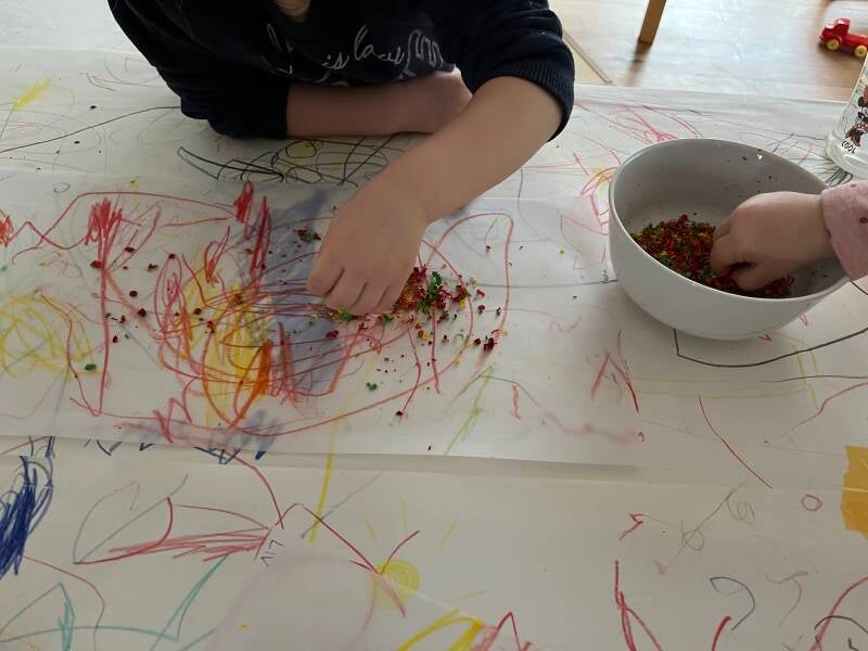 Darum ging es auch bei uns in den vergangenen Tagen. Nachdem wir immer wieder verschiedene Laternenlieder angestimmt haben und unsere Holzlaternen aufgebaut hatten, hierbei wurden wir von unseren Fellnasen tatkräftig unterstützt, konnte das gestalten der Laternenfenster losgehen: Wir haben mit Wachsmalkreide unser Laternenpapier bemalt. Die Wachsmalkreide haben wir auch zu feinen Flocken mit der Küchenreibe gerieben und diese ebenfalls auf unserem Laternenpapier verteilt. Dann ging das Papier ab unters Bügeleisen und schwupp, ist die ganze Wachsmalkreide zerschmolzen. Das war spannend zu beobachten!
