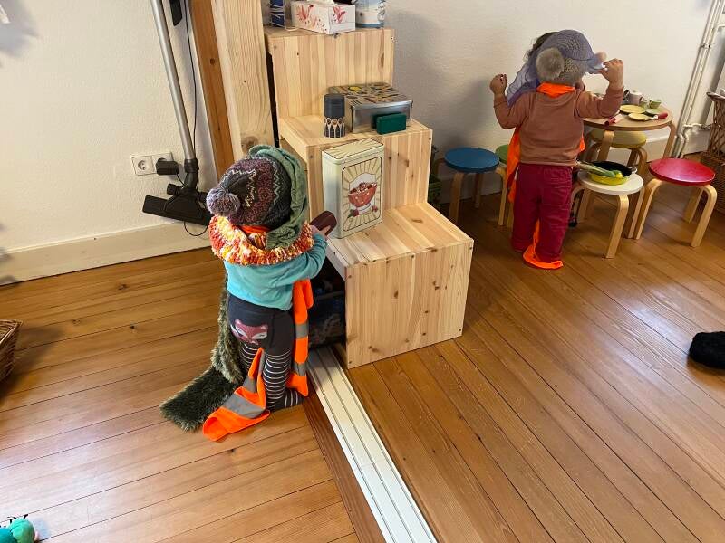 Diese Woche haben wir auch wieder einen Teil unseres Spielmaterials ausgetauscht und erfreuen uns aktuell sehr an unserer Spielküche. Es wird tagtäglich "Essen gekocht"! Viel Spaß hatten die Kinder die letzten Tage auch an unserem Verkleidungsmaterial, es wurde so viel wie nur möglich auf einmal anprobiert!
